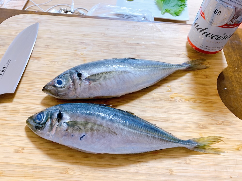 2本目のビールを飲んでいたらちょっと焦げたけど、味のある見た目になったのでよしとする。鯵だけに。