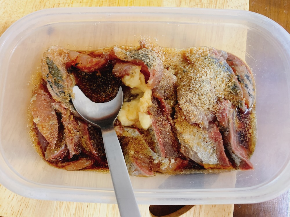 醤油、味醂、生姜、すりごまらへんを適当に混ぜる。適当でいい。たまにしょっぱすぎる感じに仕上がるけど、その時は卵黄でも乗せて白米と食べれば解決だ。