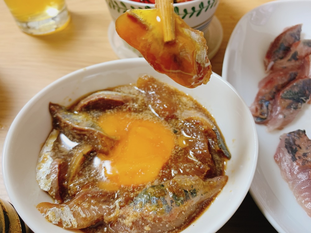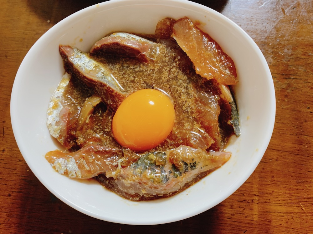 醤油、味醂、生姜、すりごまらへんを適当に混ぜる。適当でいい。たまにしょっぱすぎる感じに仕上がるけど、その時は卵黄でも乗せて白米と食べれば解決だ。