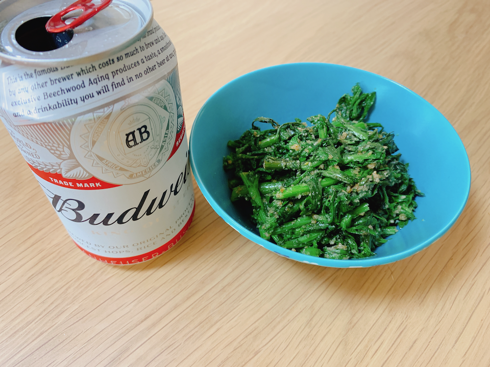 生でシーザーかゴマなどのクリーム系ドレッシングを合わせたサラダにするとワインにもよく合うが、今日は焼酎なので胡麻和えに。
