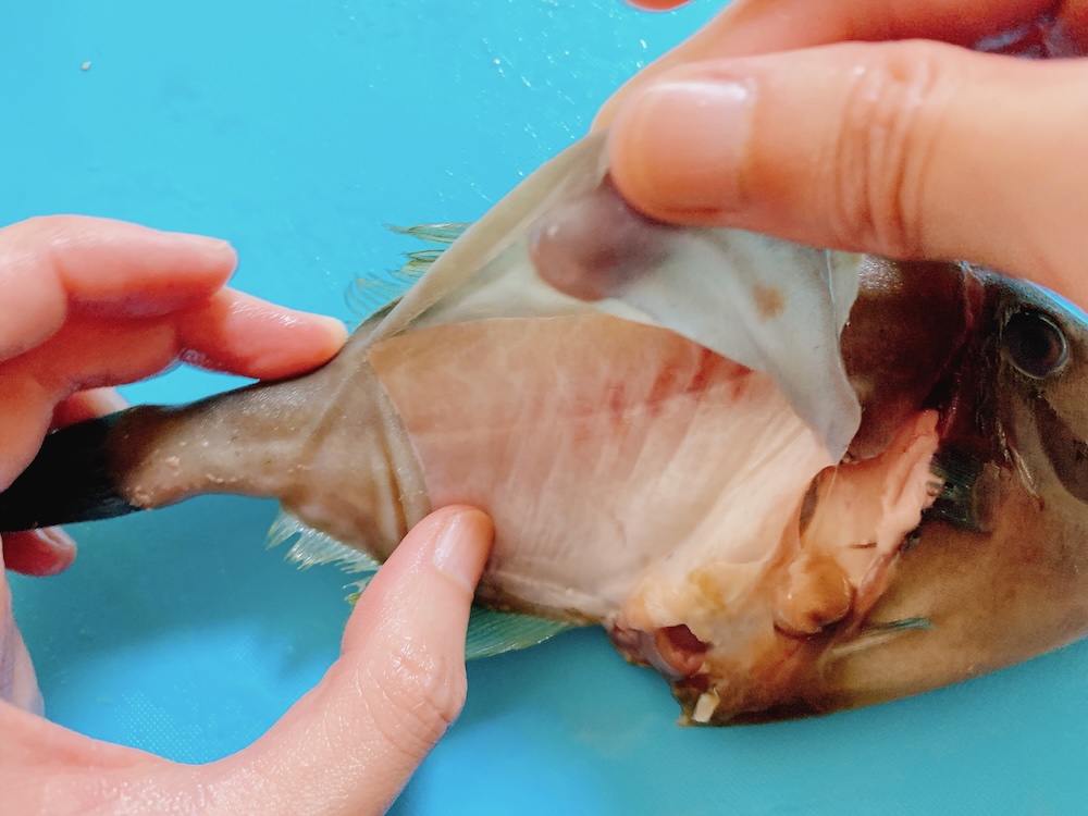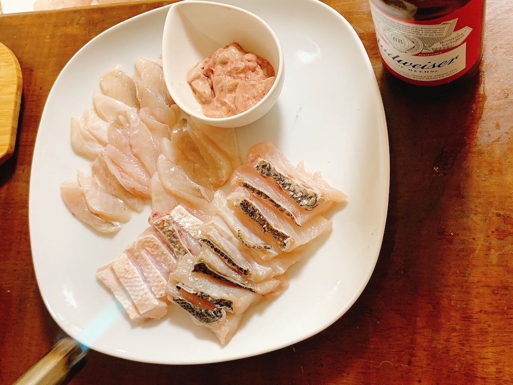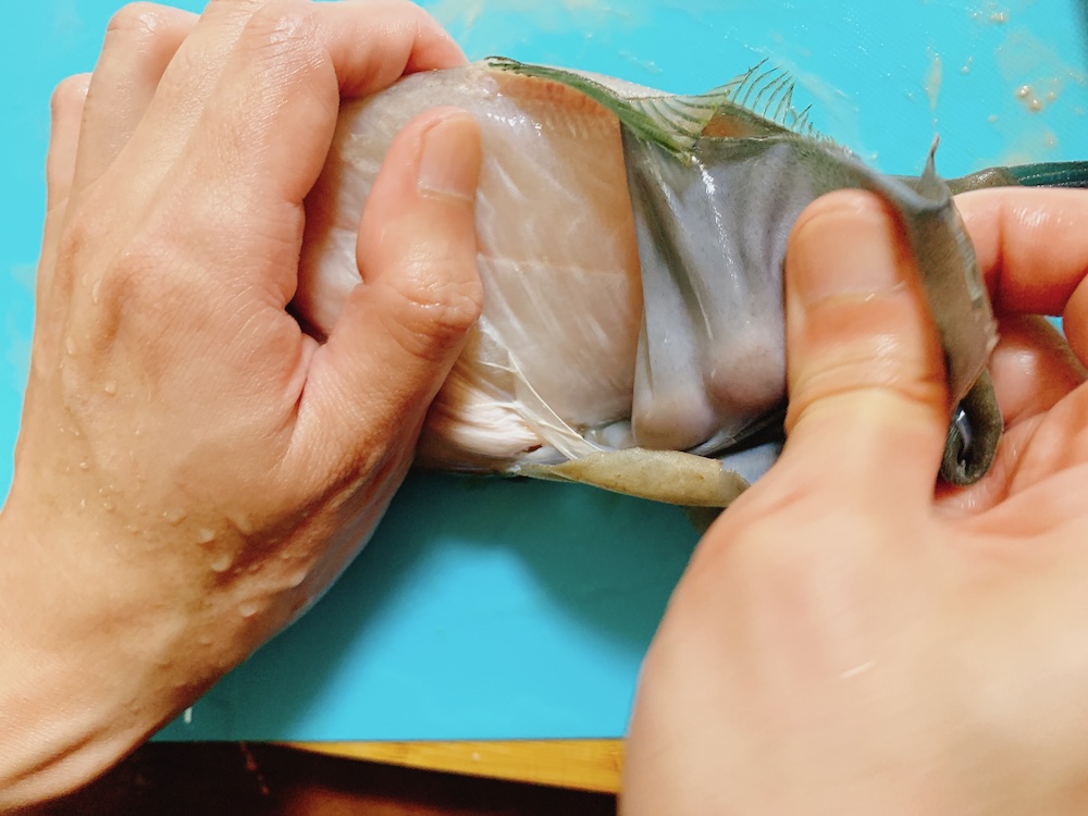 鱗は黒いけど身は綺麗な白身で、白ワインによく合いそうだなあ…。