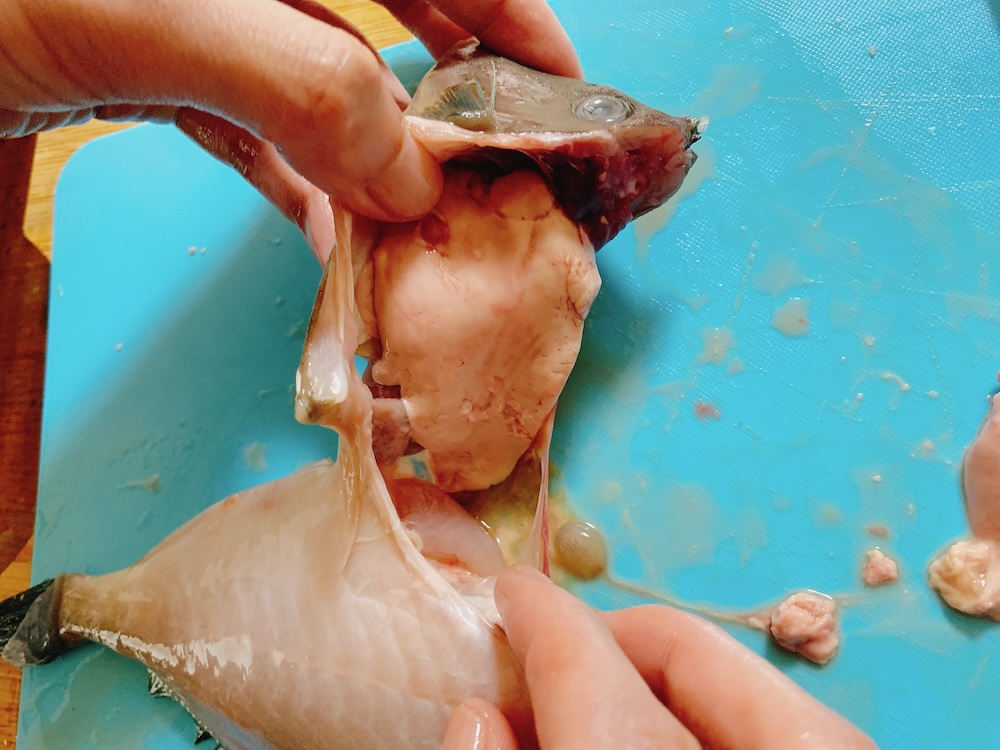 ハサミでなんとか切れ目を入れると、キモが登場。