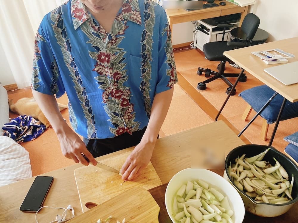 古着屋で掘り出してきたばかりのアロハがご機嫌だ。