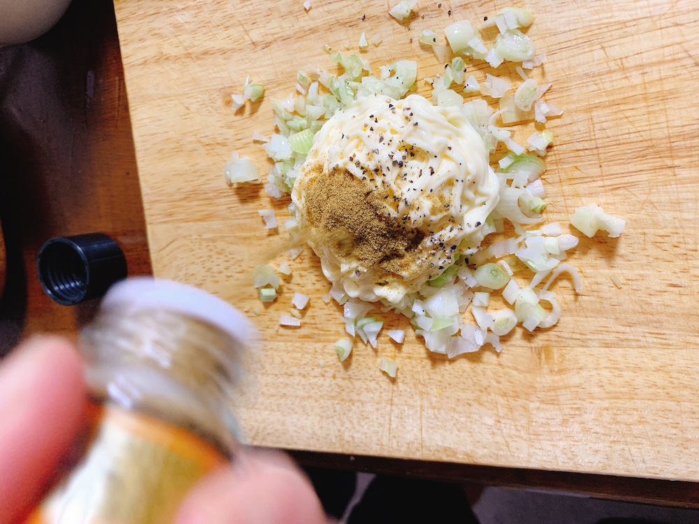ラッキョを刻んでマヨネーズ、コショウに、クミンが隠し味。