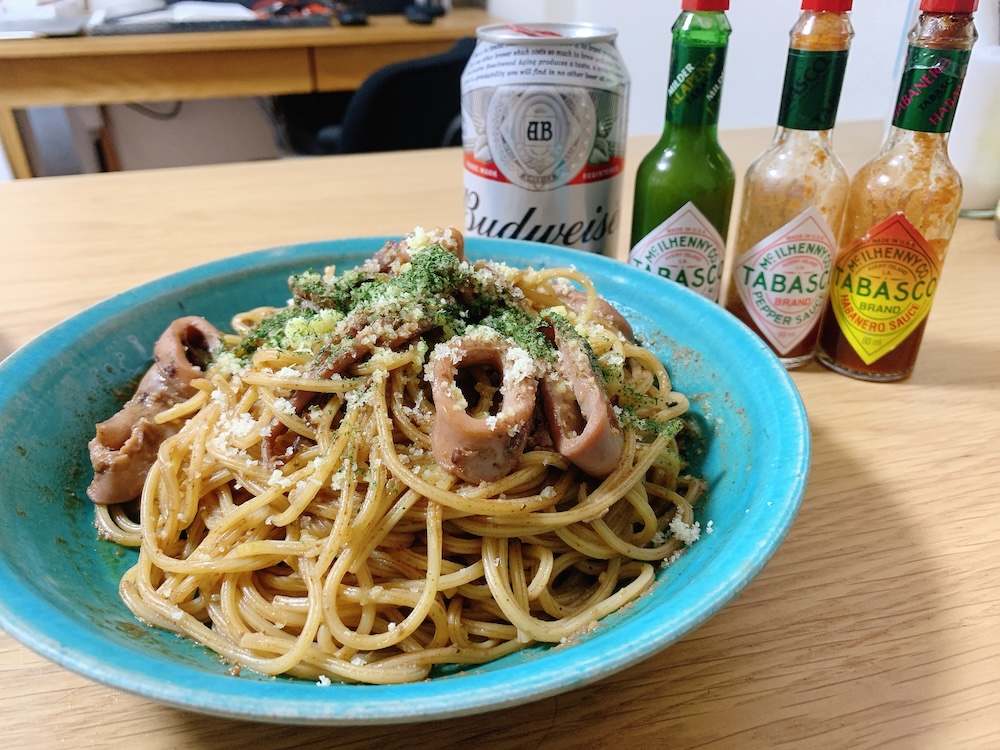 半分はつまみに、もう半分は塩茹でしたパスタと和えて炒めた。