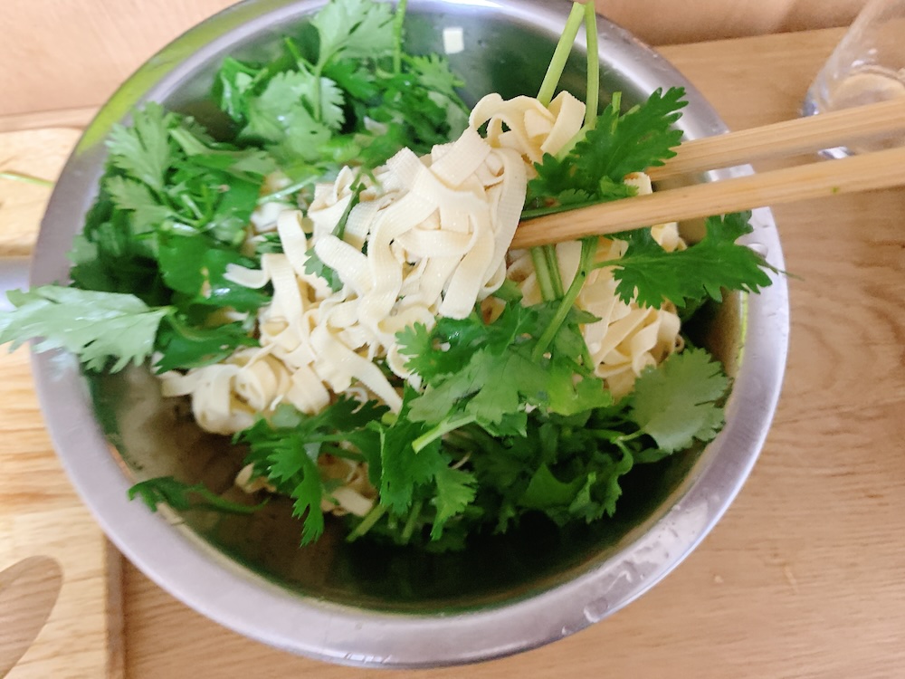 パクチー好きな人はもっとたくさん入れてもいいし、苦手な人は大葉とか他の薬味で代用したり、豆腐皮に味付けしただけの状態でも美味しい。