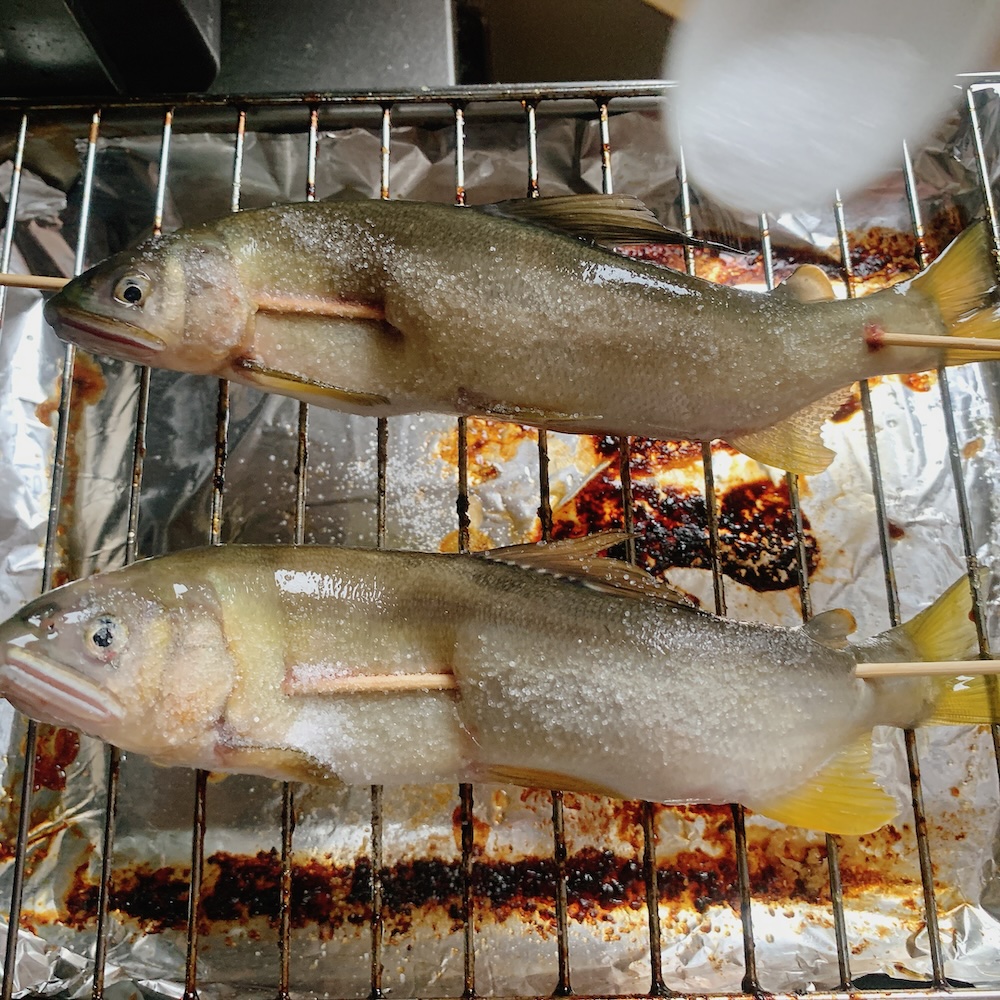塩振って、ご家庭のグリルで2尾焼いていくよ。