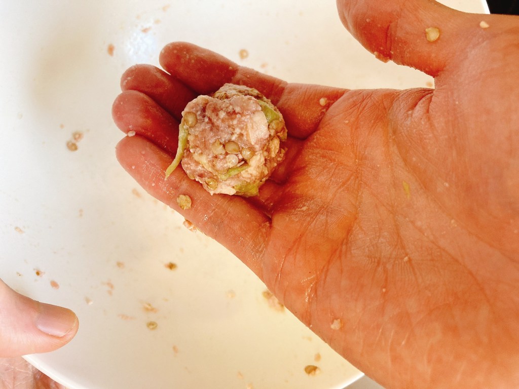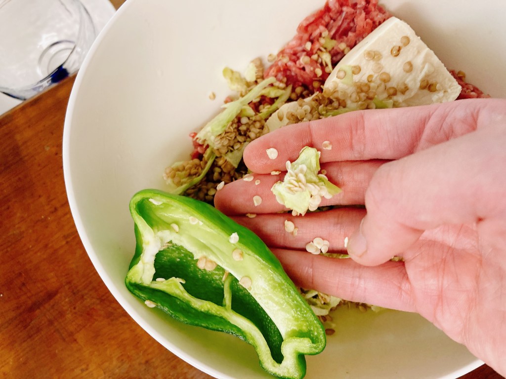 POINT!タネとふわふわを、ひき肉、お豆腐(半分)、に混ぜ合わせていきます。このタネの粒感&ふわふわの食感がアクセントになります!