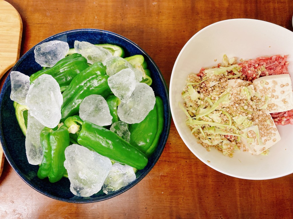 ピーマンには氷を添えて『冷やしピーマン』に。お酒を飲む人はご存じ、冷やしピーマンってめちゃくちゃ優秀なおつまみになるんです。このまま食べてもGOOD。宅飲みでとりあえず一品で出てきたら、気が利きすぎて惚れちゃいます。