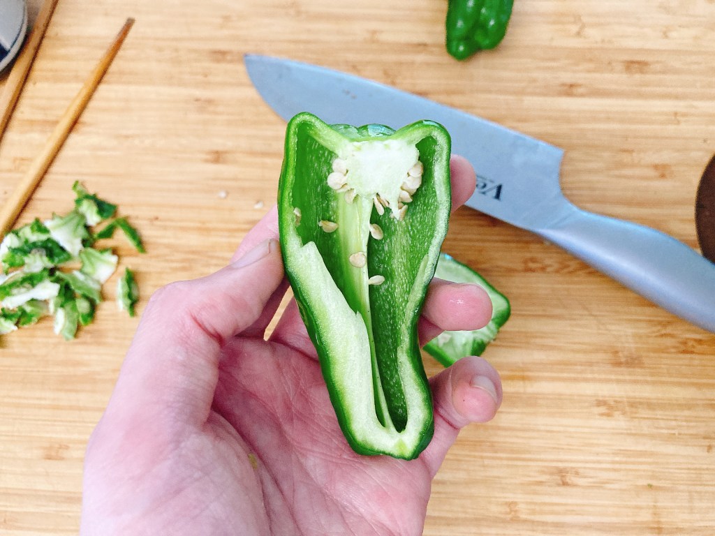 まずはピーマンを半分に切っていきます。ヘタだけ取り除いたら、タネとふわふわの部分は捨てないでね。