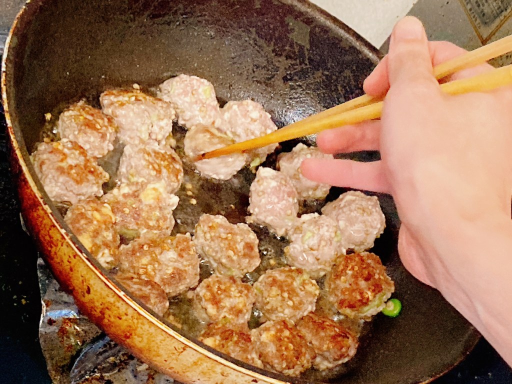 一口大に丸めて焼いていきます。一口大にしておくのも、大事なポイント!たくさん作って味変ができるので、おすすめです。