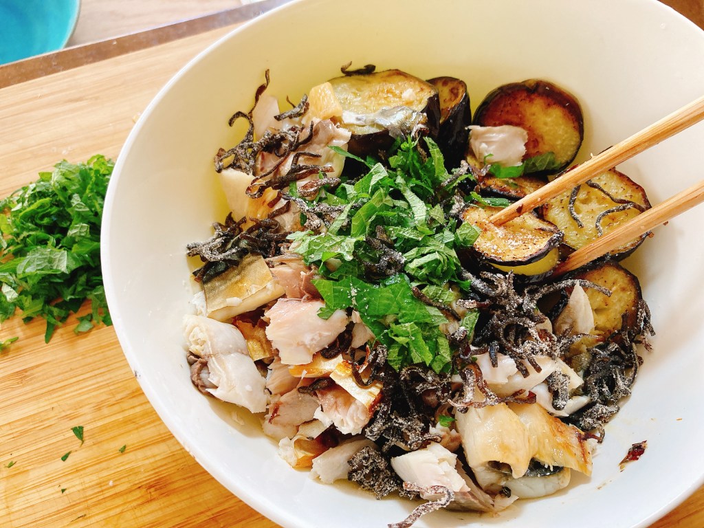 一口、頬張るとナスと塩サバから、脂がたっぷり溢れ出す。良質な脂を追うように、大葉と塩昆布の爽やかな香りが駆け抜けていく。すっきりとしたあと味で、また一口と箸が止まらなくなってしまう。ゴマを振っても風味が上がることだろう。