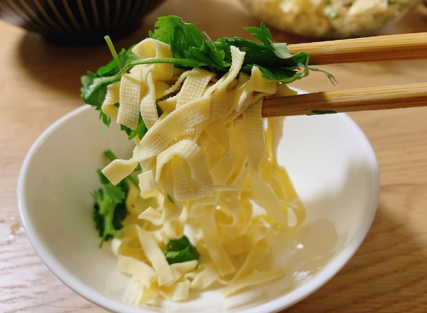 最初に紹介するのは、業務スーパーの冷凍コーナーに売っている豆腐皮(トウフーピー)を使った『香菜干絲(シャンツァイカンス)』です。中華や台湾料理のお店で、スピードメニューで出してくれる香菜干絲は、冷菜としてうれしい一皿です。