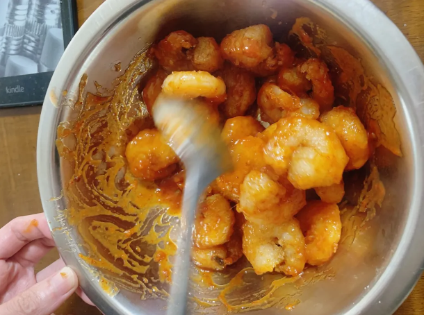 塩コショウでざっくりと混ぜ合わせ、なじませます。その間に業務スーパーの調味料を使って、辛旨のエビチリソースを作っていきましょう。