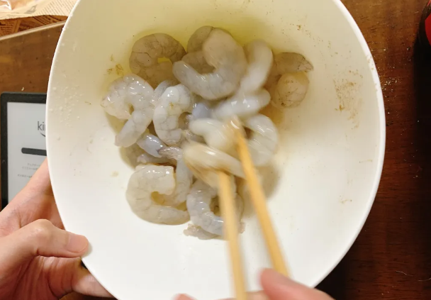 エビチリ、エビマヨにも使えるむきえびは300gとボリューム満点で、一袋で十分な量が作れます。半解凍してボウルに移して下味をつけていきます。