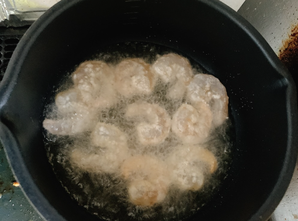 下味をつけた大粒えびに片栗粉をまぶじてカラッと揚げます。20~30秒ほどで火が通り、キレイな赤色に色づきますので、縮まないようにさっと取り出します。