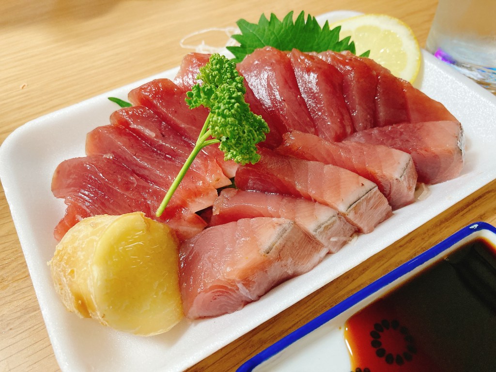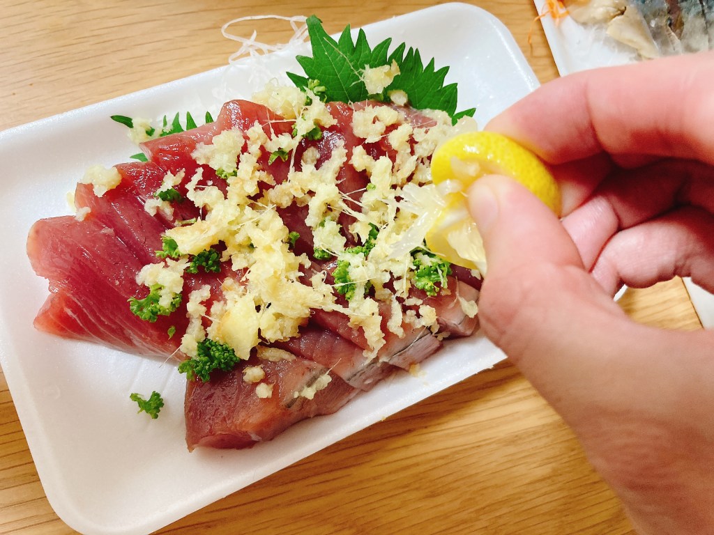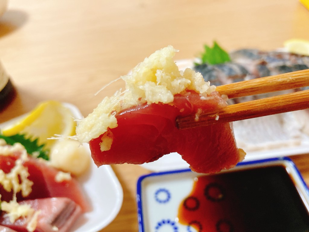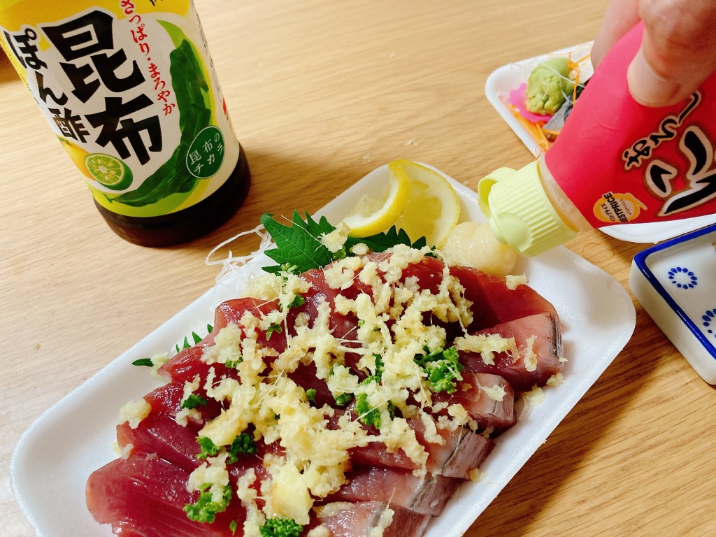 にんにくを足して、『しょうがにんにくレモン』でもいただきます。ポン酢で食べるのもオススメです。カツオは薬味のバリエーションで七変化するので、これがまた酒飲みを喜ばす食べ物なんですよね。
