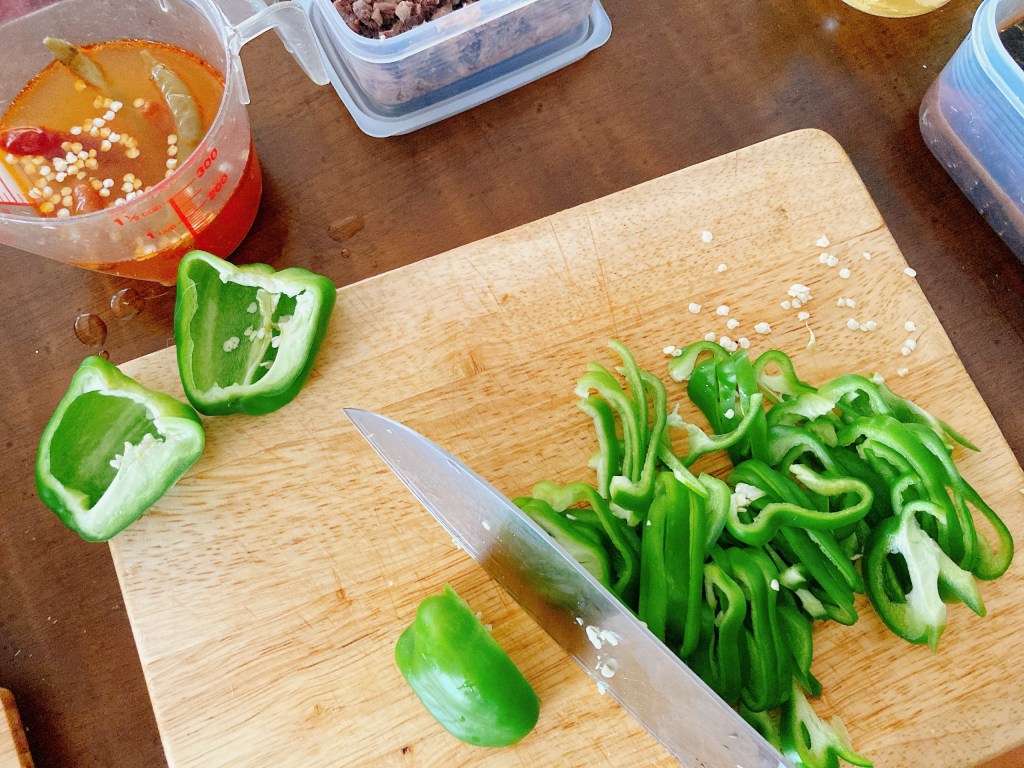自家製のコーレーグースーにお酢としょうゆ、ゴマ油を足して『南蛮漬け汁』を作っていく。ピーマンは細切りにして漬け汁と合わせる。こちらを鍋にかけて、ふつふつしたらピーマンを入れて軽く混ぜて火を止める。