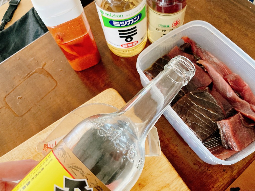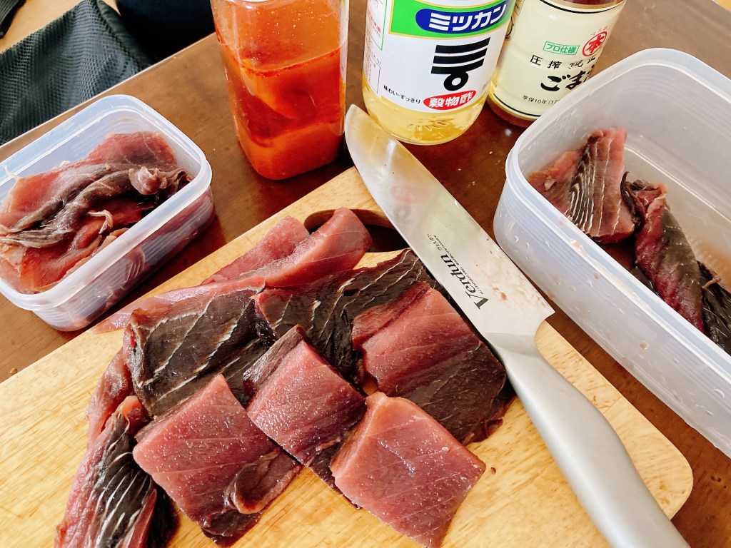 マグロのアラは一口大にブツ切りにしていく。小さな部分は柴犬ニハチのご飯行き。そして、しょうゆとにんにく、泡盛と一緒に漬けておく。