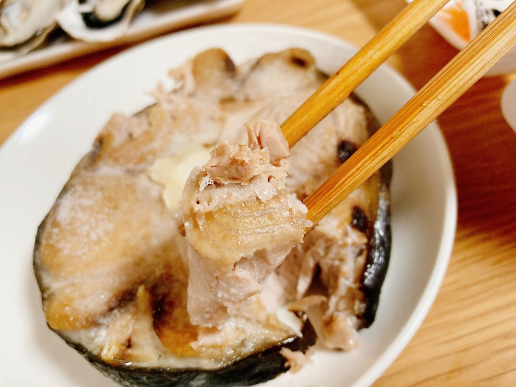 この日の大収穫はマグロテール。これをグリルで塩焼きにしてツツけば焼酎泥棒間違いなしだ。じっくりと塩焼きにしながら、特売でゲットしたトロオチをつまむ。