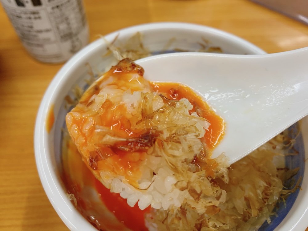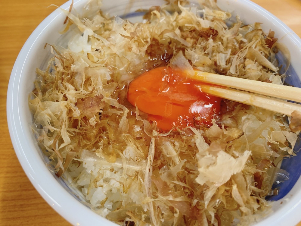 削り節がいい香りだ。卵も栄養豊富な色をしている。