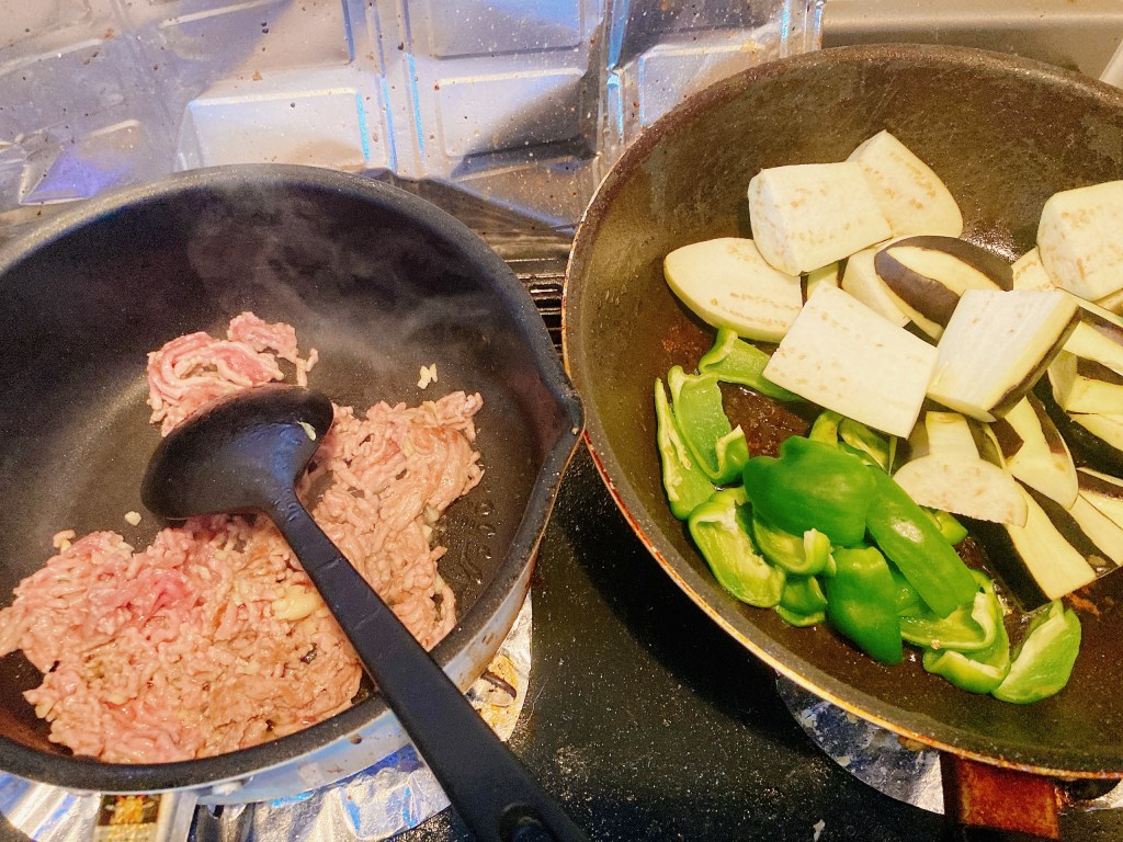茄子、ピーマンをザク切りにして、にんにくをみじん切りにしていく。茄子の皮はピーラーで縞目状に剥いていく。残った皮は捨てずにキンピラ茄子にしていく。キンピラ茄子はパリッコさんのレシピで、最高のつまみになる一品だ。ピーマンはひとつかふたつ残して冷凍庫に入れておこう。あとで前菜になる。