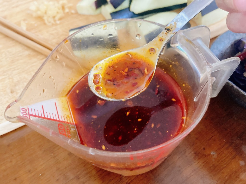 豆板醤、花椒(ホアジャオ)、辣油の他、ゴマ油などでタレを作る。今回は、隠し味に『魚醤』を使って本場四川の『魚香茄子』の香りを再現する。