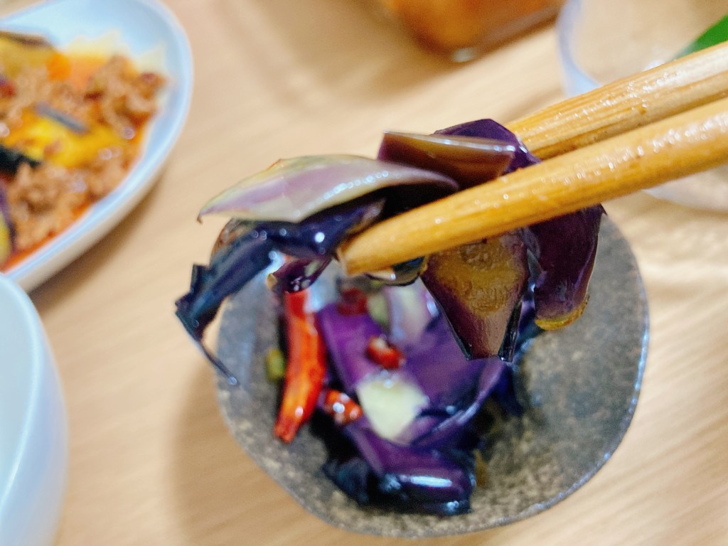 こちらもいただいていこう。金平茄子。やはり茄子は皮が一番うまい。ゴマ油とにんにくの香り、ピリ辛に仕上げた大人のための逸品。次回からは多めに茄子の皮を剝いてしまいそうだ。
