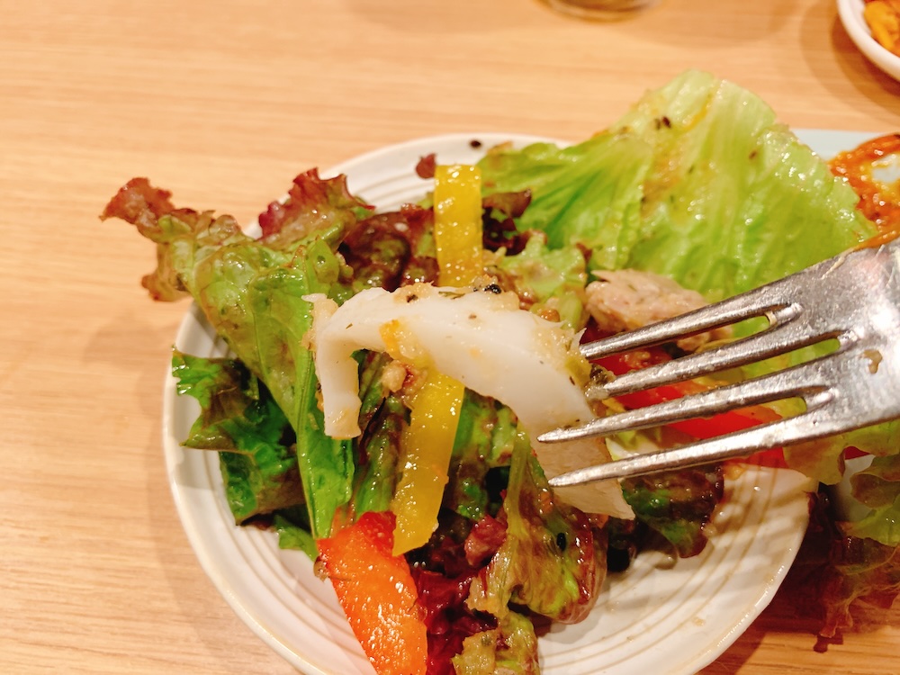 シーフード入りのサラダは、ドレッシングも本格的で酒のアテになる。そろそろワインが欲しいところ。