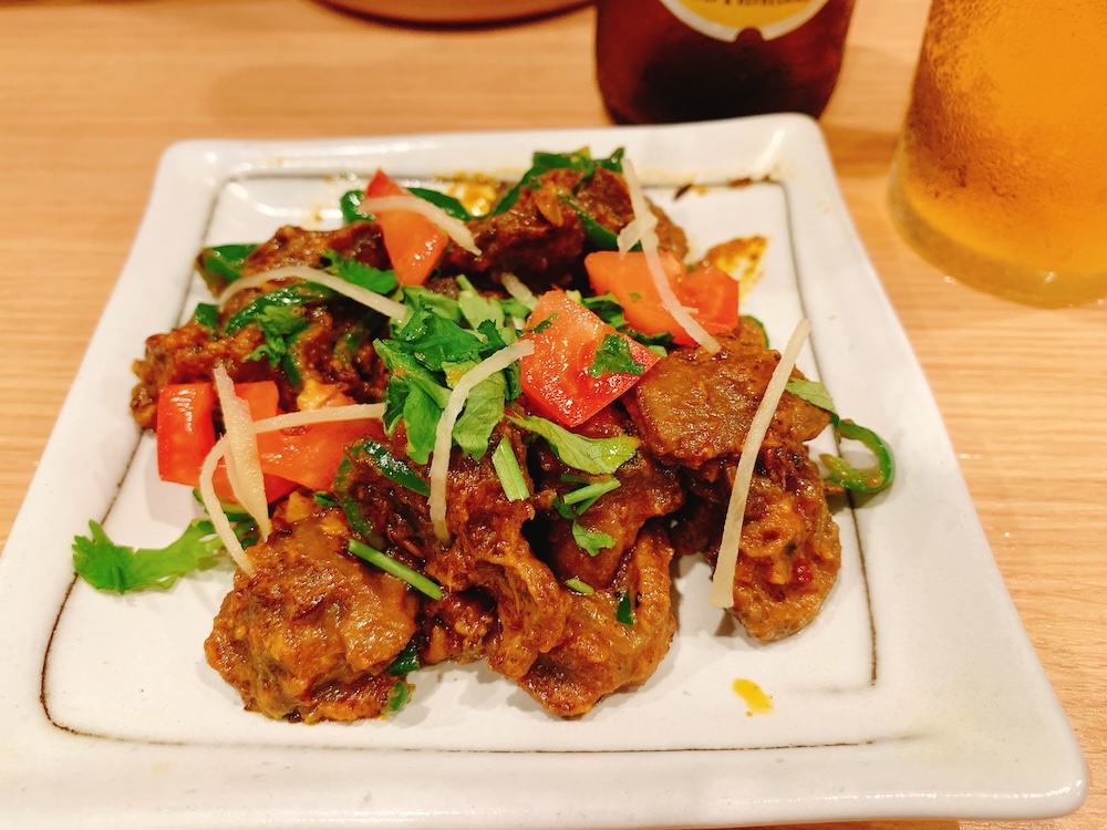 コリコリした食感に、惜しみないスパイスの味付け。トマトの酸味と針生姜も爽やかだ。