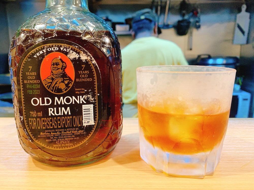 ビールとワインで料理を堪能した後は、デザートがわりにラム酒をロックで飲んで帰る。こちらもインドのラム「OLD MONK」