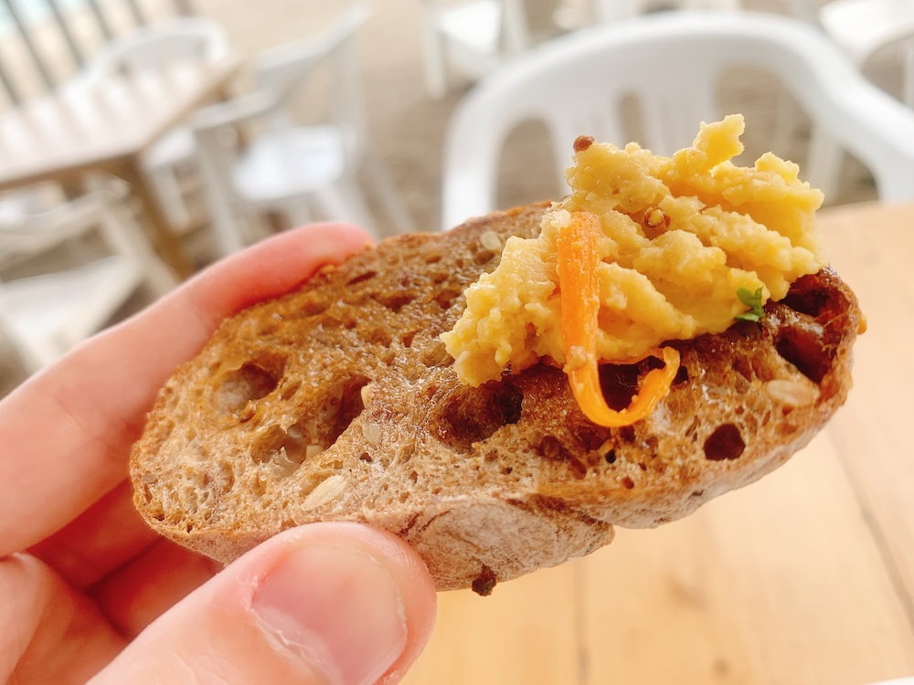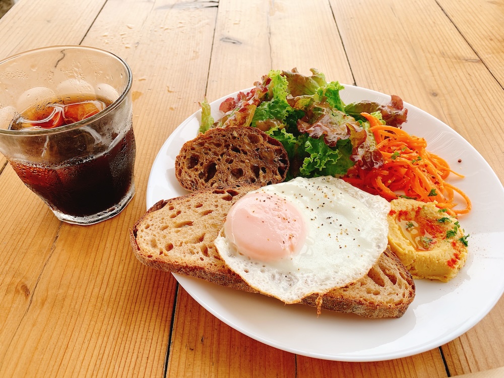 パンが2種類。目玉焼き、フムス、サラダ、キャロットラペ。