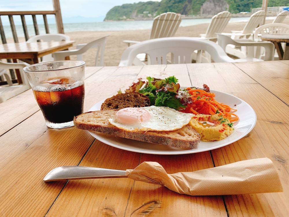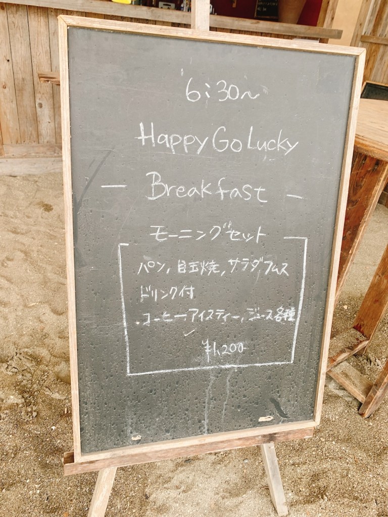 この海に来るたび何度かお邪魔している、非常にイケてる海の家『Happy Go Lucky』さんが朝食をやっているとのことで、曇天の中、憂いを含んだハンサムな横顔(二日酔い)で食べに行くことにした。