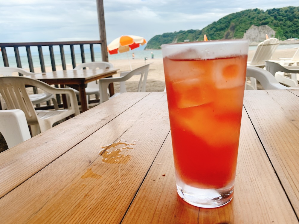 海沿いなので、カンパリソーダに見えなくもない赤い色。味わいにも通じるものがあるが、甘さは控えめ。