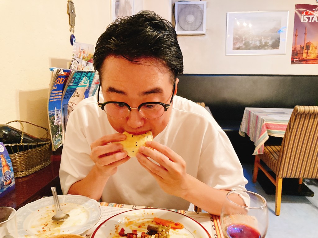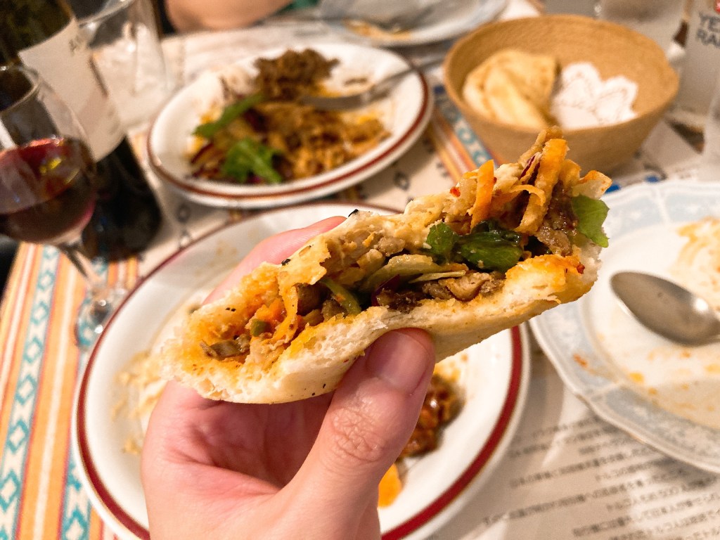 追いケバブ、追い野菜をしながら、たっぷりいただいていく。ワインもスイスイ進んでしまう。トルコアズはピタパンが感動的にうまい。焼きたての香ばしい香り漂うピタパンは350円で4枚ついてくるので絶対に頼んでほしい。結局ピタパンおかわりして8枚食べてしまった。