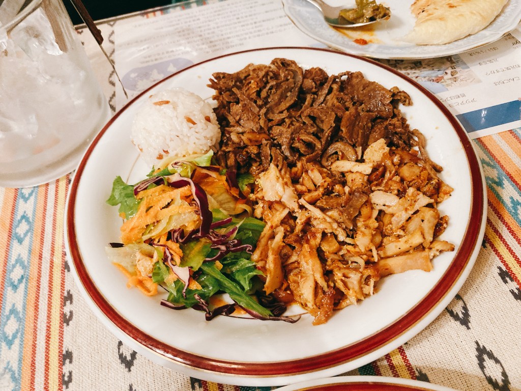 メインディッシュの堂々たる佇まい。たっぷりのドネルケバブにライス、サラダもたっぷりです。ビーフとチキンのケバブはお肉のうまみを感じる香り高い逸品。スパイスの効いた味付けで、ほろほろのお肉は噛めば噛むほど旨味が溢れてくる。『中東の宝石』とも言える最高の一皿です。赤ワインと一緒にいただくのがおすすめ。