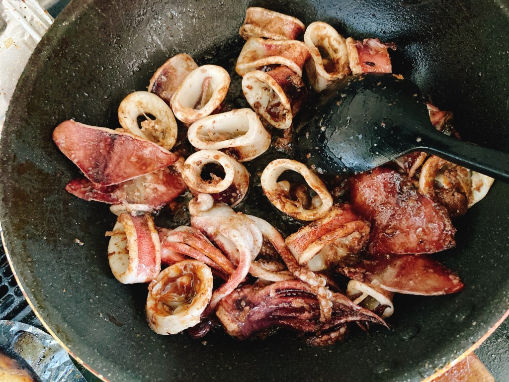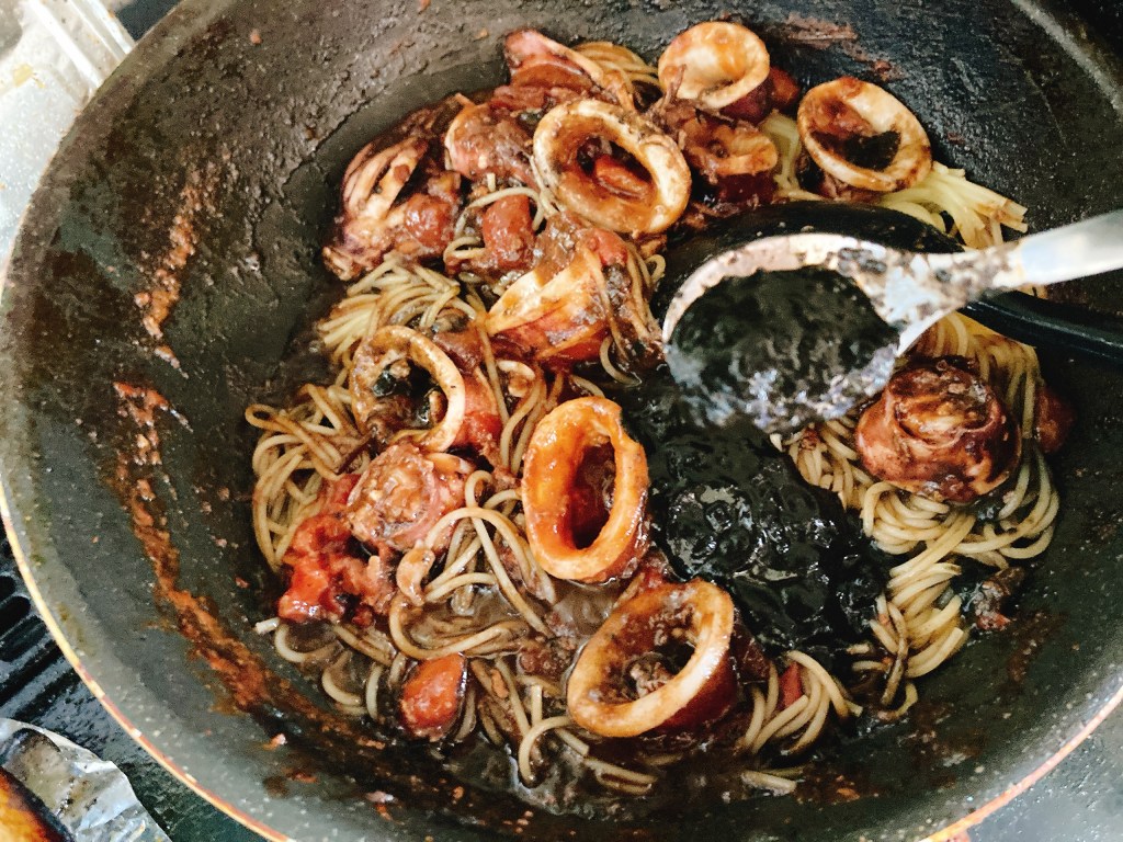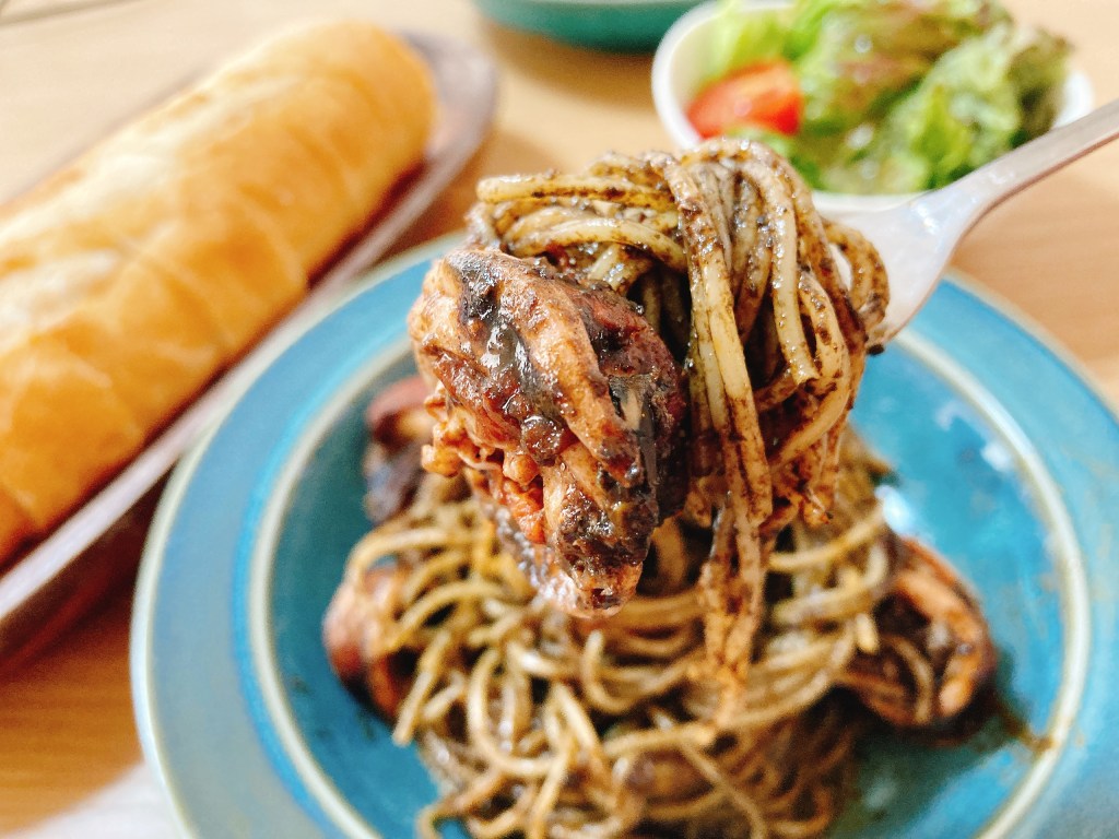「うんまい!これは旨すぎる。」ぶりんぶりんのイカの身にたっぷりのイカワタとイカ墨が絡みます。これはお酒に合うこと間違いなし。