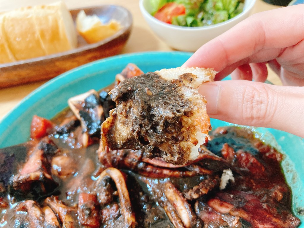 これでもかと贅沢に。イカワタとイカ墨ソースをバゲットにひたしていただくのも格別に美味しいです。一滴残さずこそいで洗い物いらず。