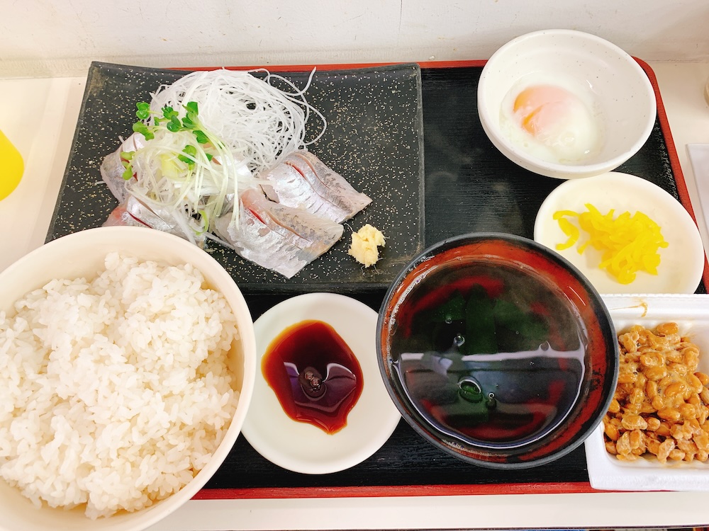 ご飯、お吸い物、漬物に、納豆と半熟の卵まで付く。