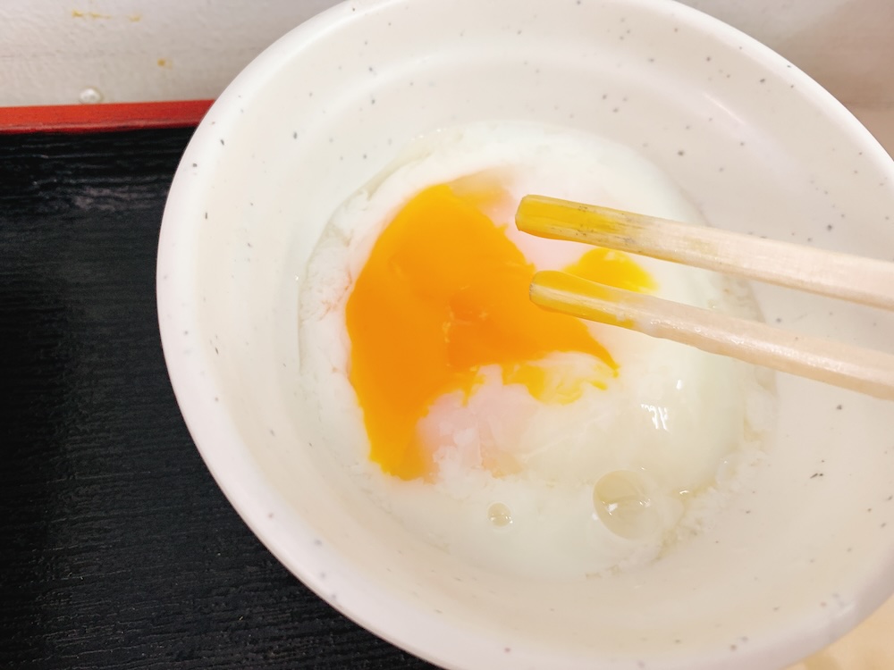 半熟ですと言って渡されたけど、これはほぼ温泉たまごだね。そのまま食べてもいんだけど…。