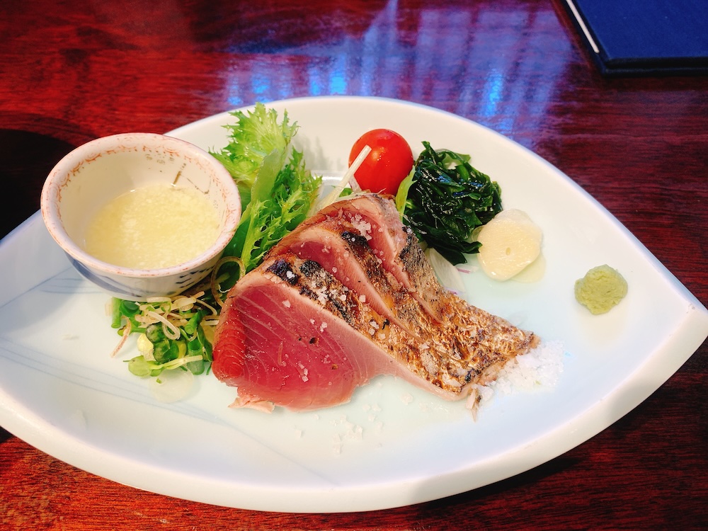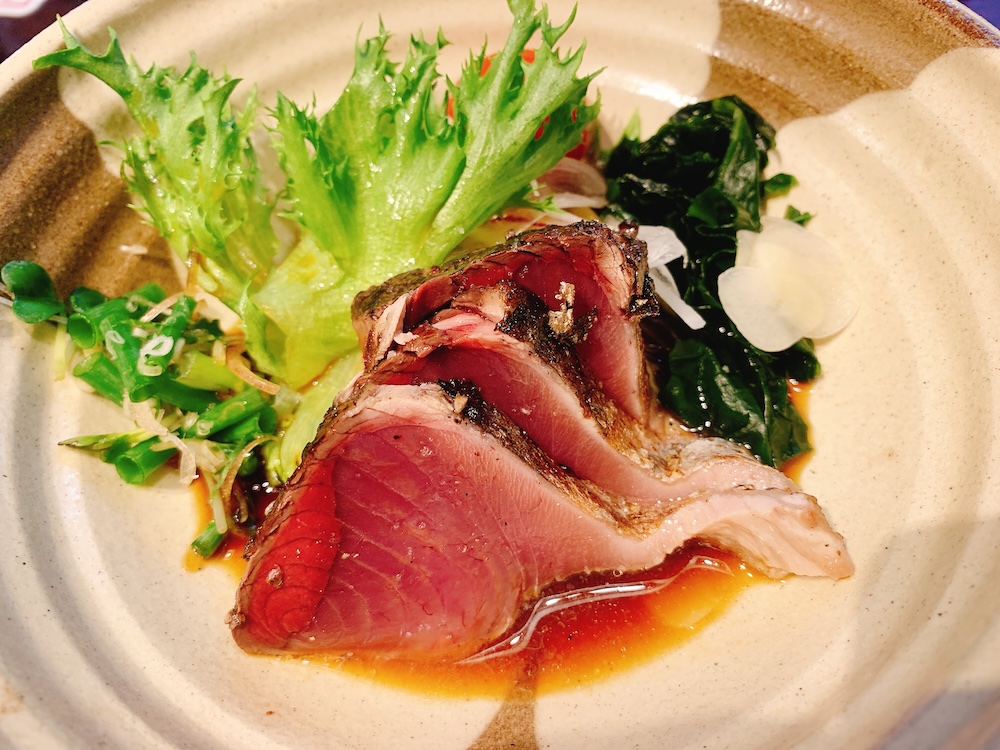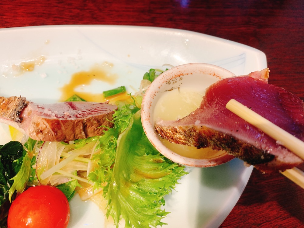 鰹のたたき、塩とポン酢でそれぞれいただきました!焼きたて〜いい匂い〜。