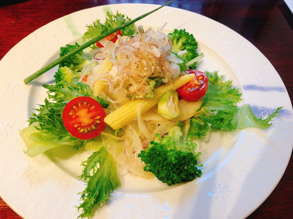 夏野菜のサラダ。この後に出てくる料理もそうなんだけど、どれも惜しみなくミョウガがのせてあるのが超嬉しい。