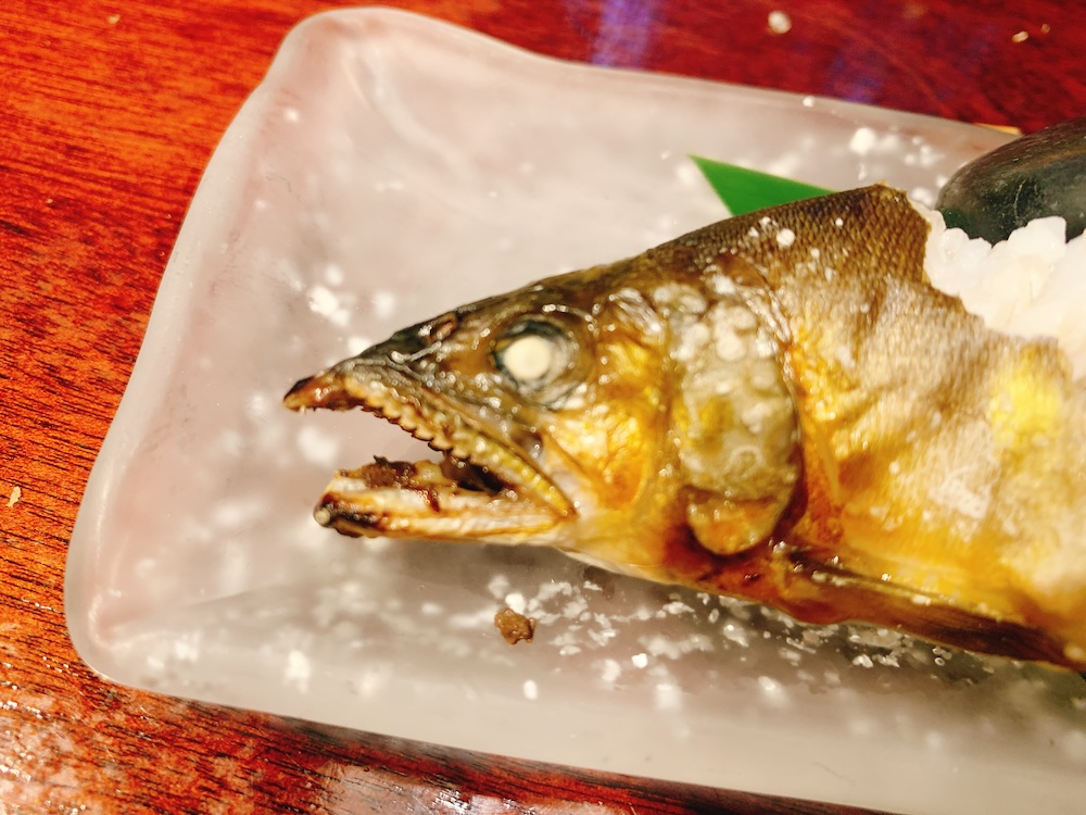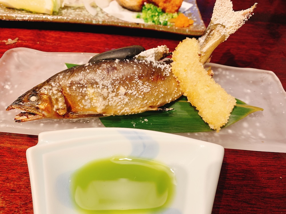 仁淀川の天然鮎の塩焼き!待ーってました。これもこのお店の名物みたい。いい反り具合だね。まだ生きて泳いでいるようだ。