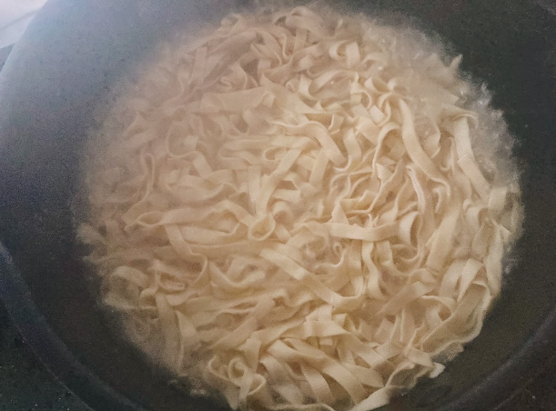 業務スーパー『豆腐皮』の使い方は簡単。凍ったままお好みの量をほぐして沸騰したお鍋で茹でます。軽く茹でたら準備完了。サラダに使う場合には流水で締めておきます。
