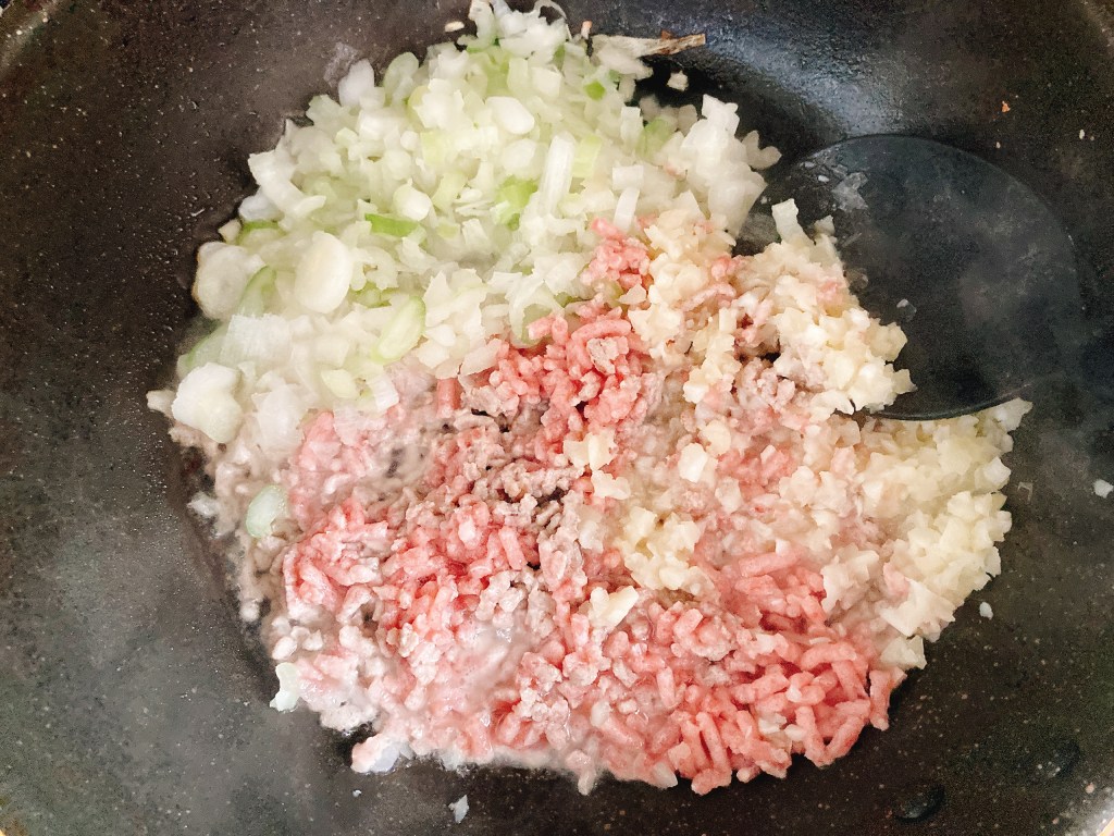 肉味噌を作ります。業務スーパーの刻みネギ、ひきにく、しょうが、にんにくを塩コショウで炒めます。
