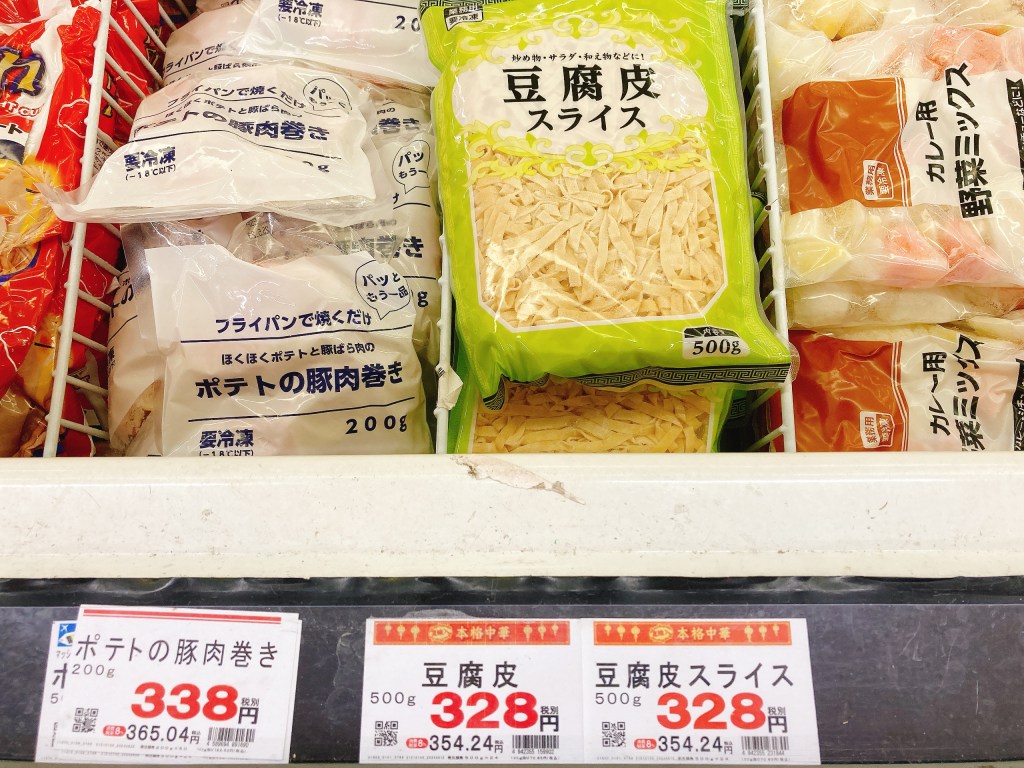 今回使うのはこちらの『豆腐皮スライス』です。業務スーパーの冷凍コーナーにある激安で手に入るうれしい食材です。中華料理屋さんでは前菜としてサラダ、和え物などに使われる定番の食材です。
