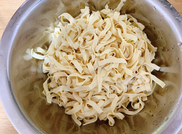 うどんのような感じで暖かいままでも美味しいです。今回は温かい担々麺と冷製の一品をそれぞれ作っていきたいと思います。まずは、温かい担々麺を作りますので茹でた豆腐皮をそのままざるにあげてお皿に盛りつけます。
