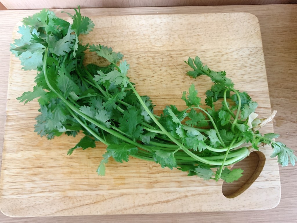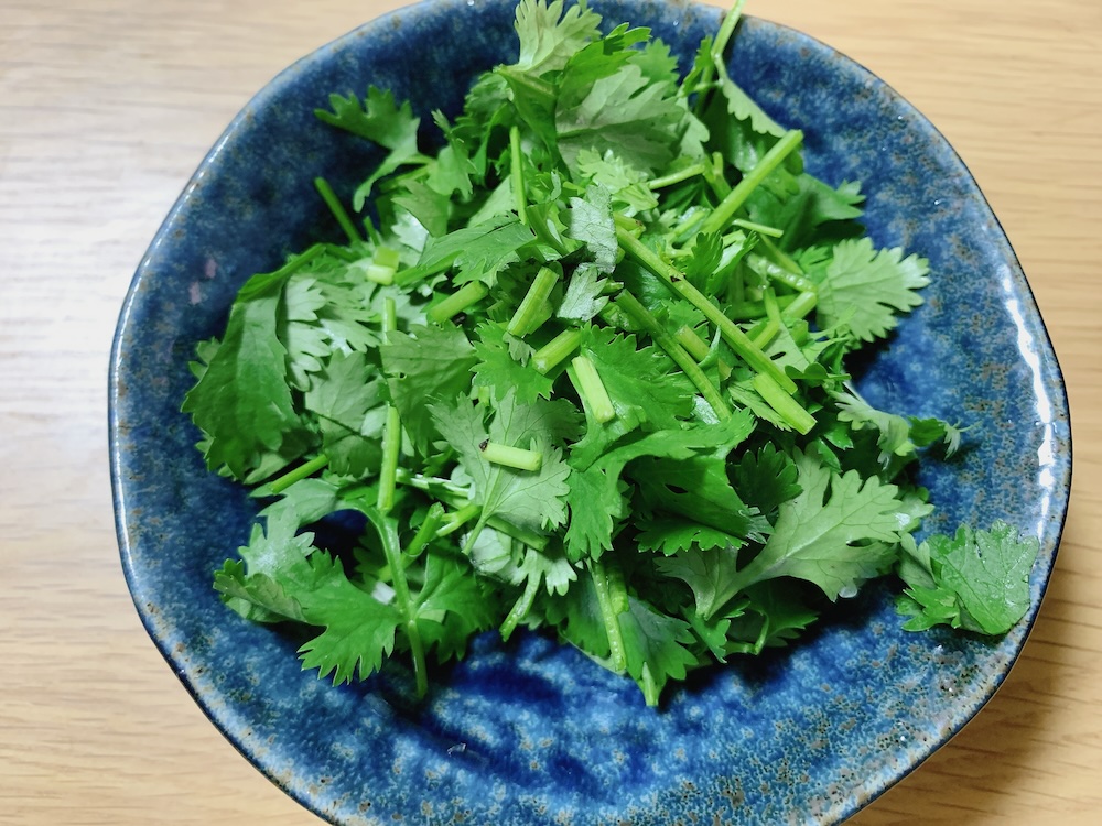 パクチー大体3株くらいを、食べやすい大きさに切ります。