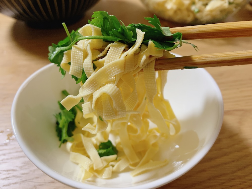 続いてのレシピは豆腐皮で作るパクチー豆腐皮のサラダ【香菜干絲】です。