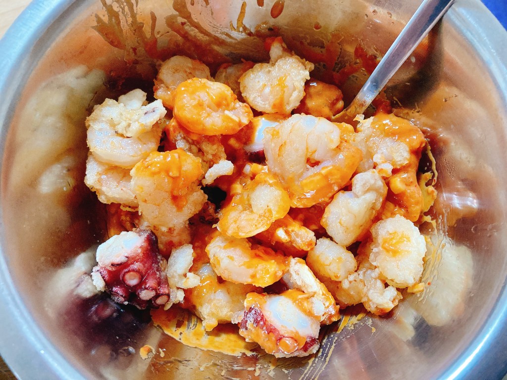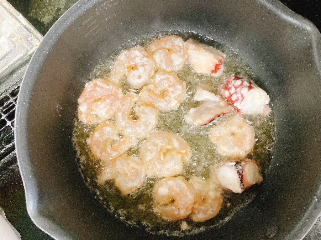 エビとタコに片栗粉か小麦粉をまぶして、カラっと揚げていきます。このまま塩を振ってタコ唐揚げにしても美味しい・・・と思いつつ、今回は勇気を出してタコチリに挑戦します。